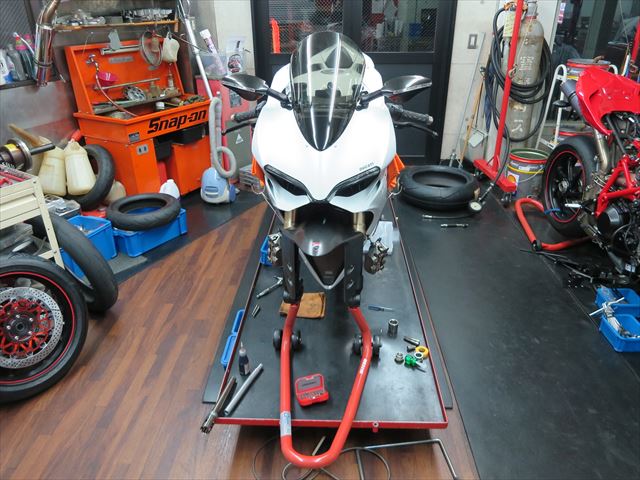 週末のRAPIDBIKE装着デモ車の試走会と 11日の筑波サーキット走行に向け最終仕上げの 1199PANIGALE。